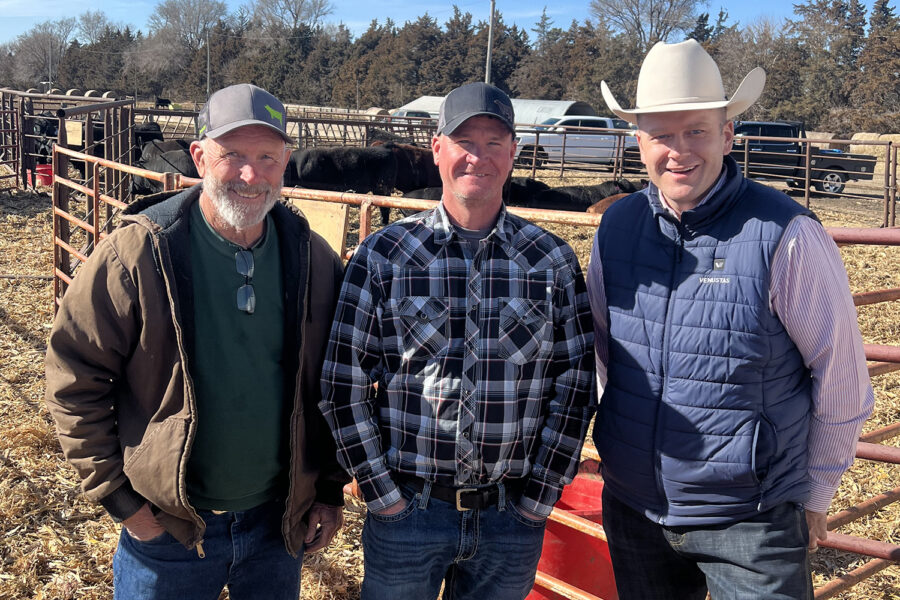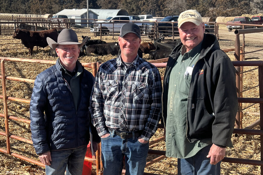 Sale manager Randall Ratliff (R&R Marketing) and Chad Settje thank Keith Doernemann (right) of Elkhorn Valley Limousin, West Point, NE, on his purchase.